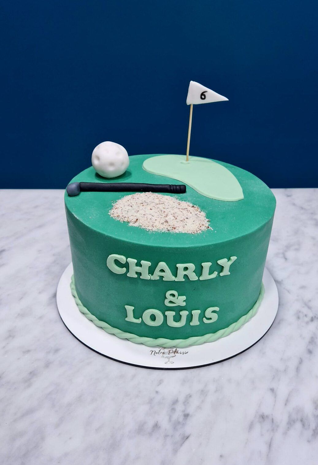 Un gâteau vert, avec un drapeau, une balle de golf en sucre et même un effet sable comestible.