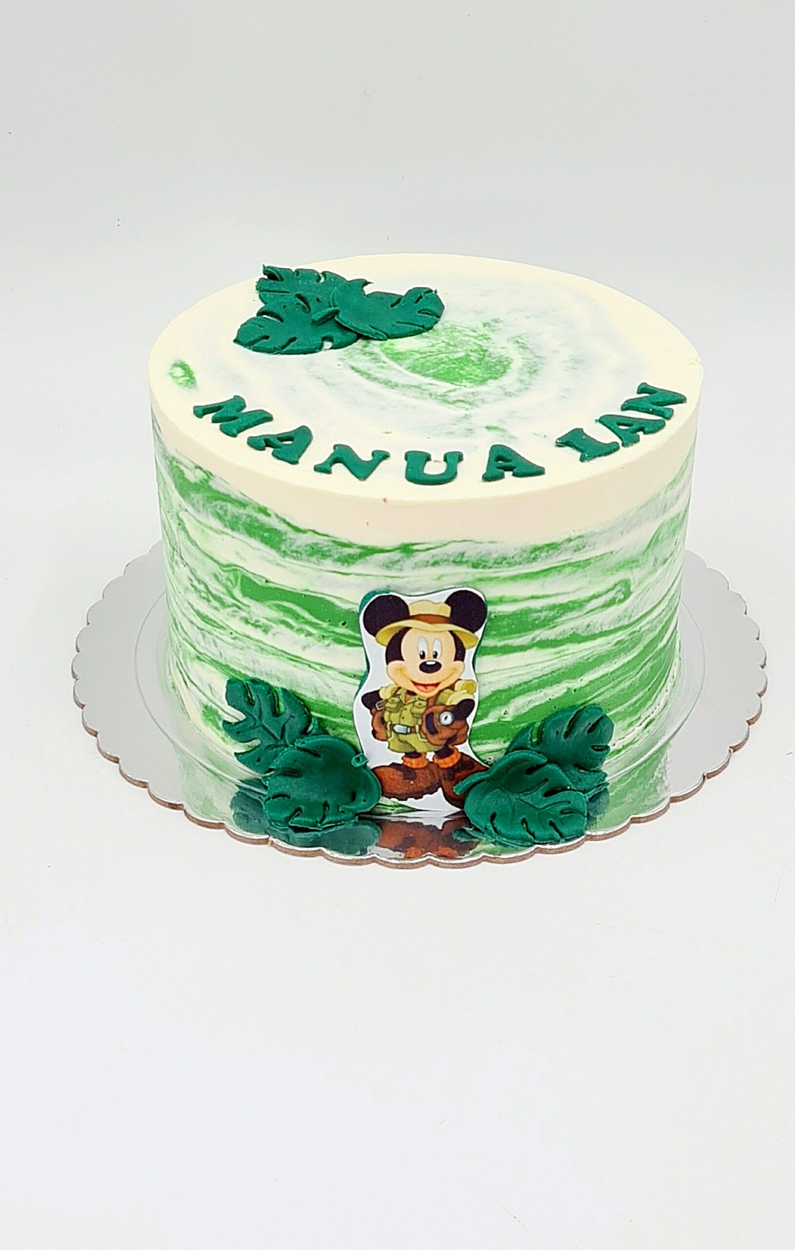 Le gâteau décoré "Mickey Jungle" est une création ludique et colorée qui associe l'univers emblématique de Mickey Mouse à une ambiance de jungle exotique.
